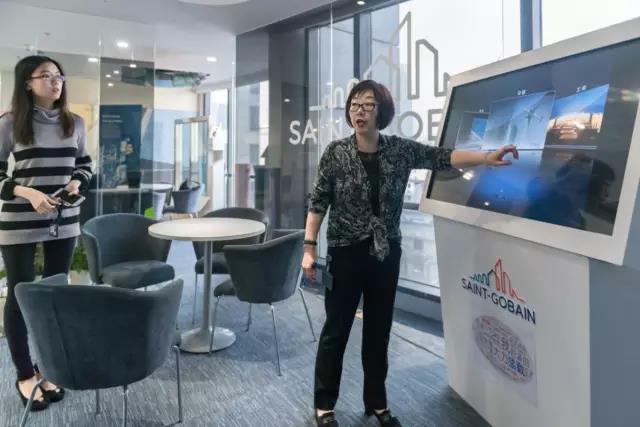 简单的自我介绍之后,她迫不及待地走向触摸板,带着我们这群好奇宝宝们开始了一段了解圣戈班的奇妙之旅——