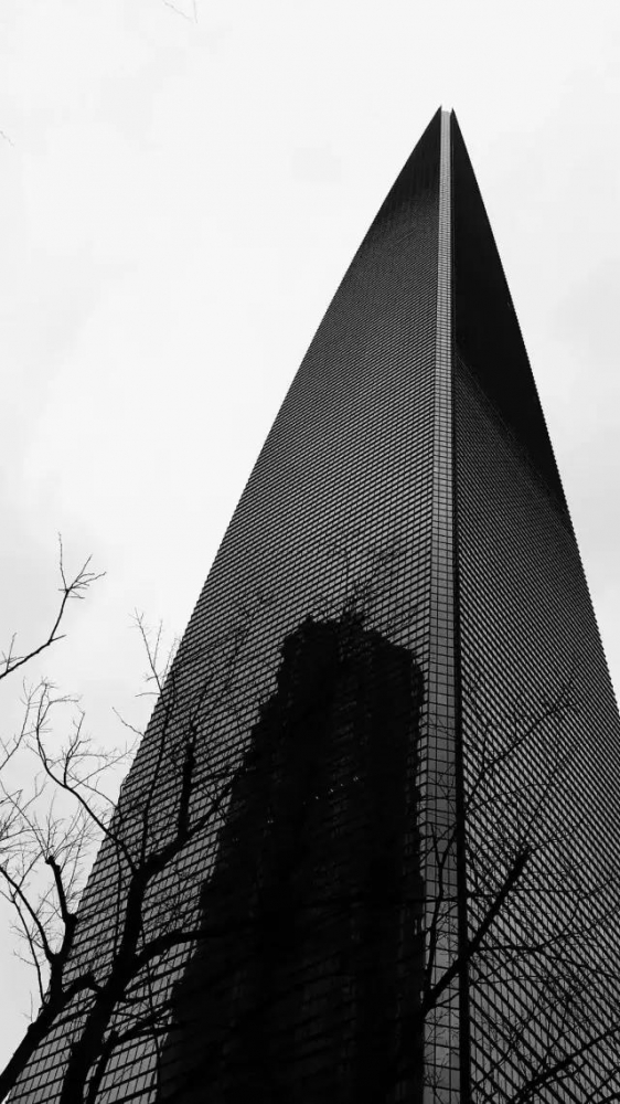 建筑外的行人仰视建筑,玻璃幕墙搭建的高楼层次分明,恢弘气派,严肃冷峻,而建筑舒适只存在于建筑之内。